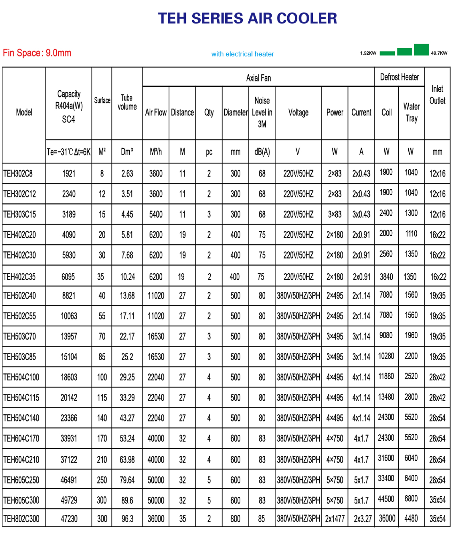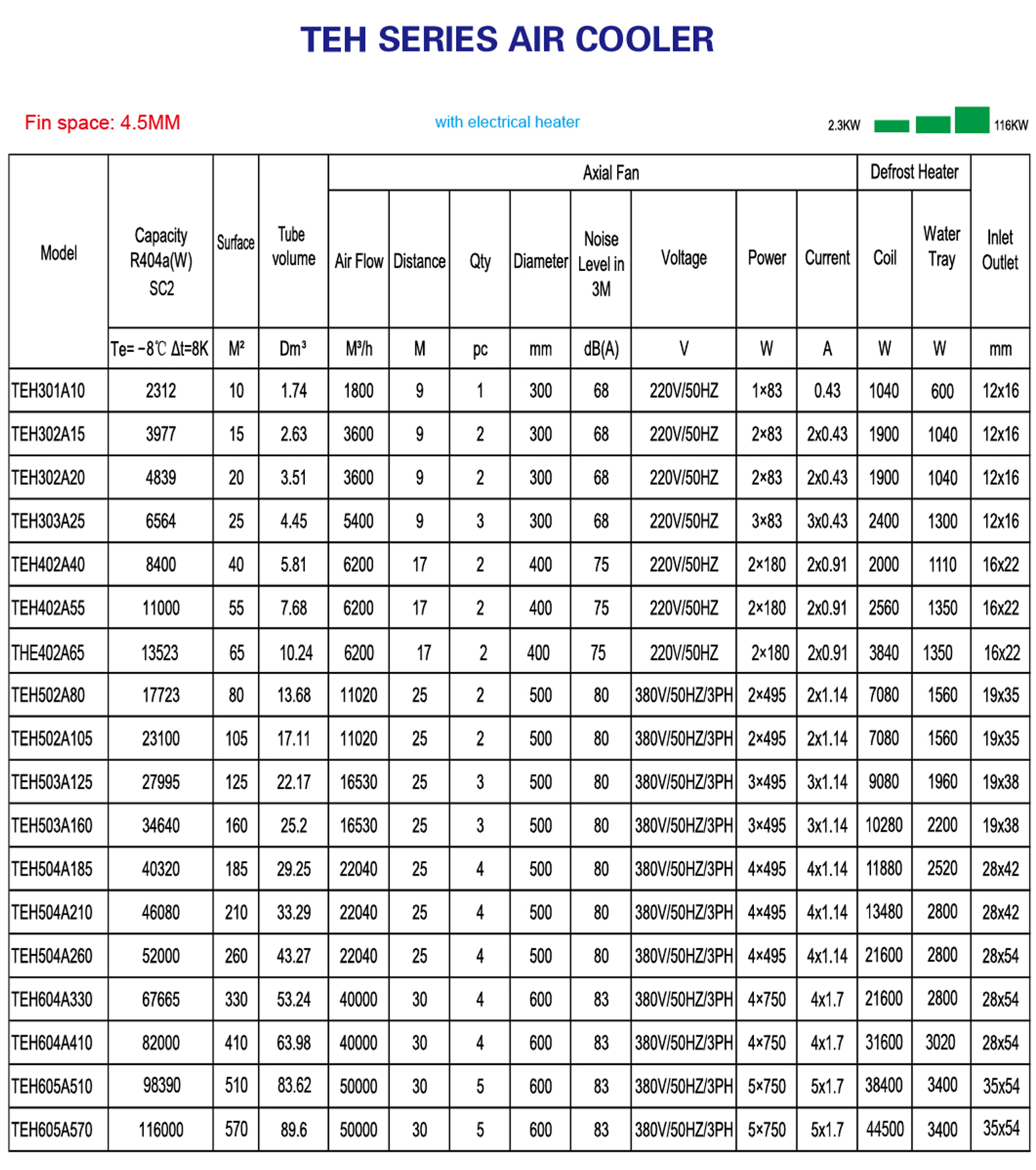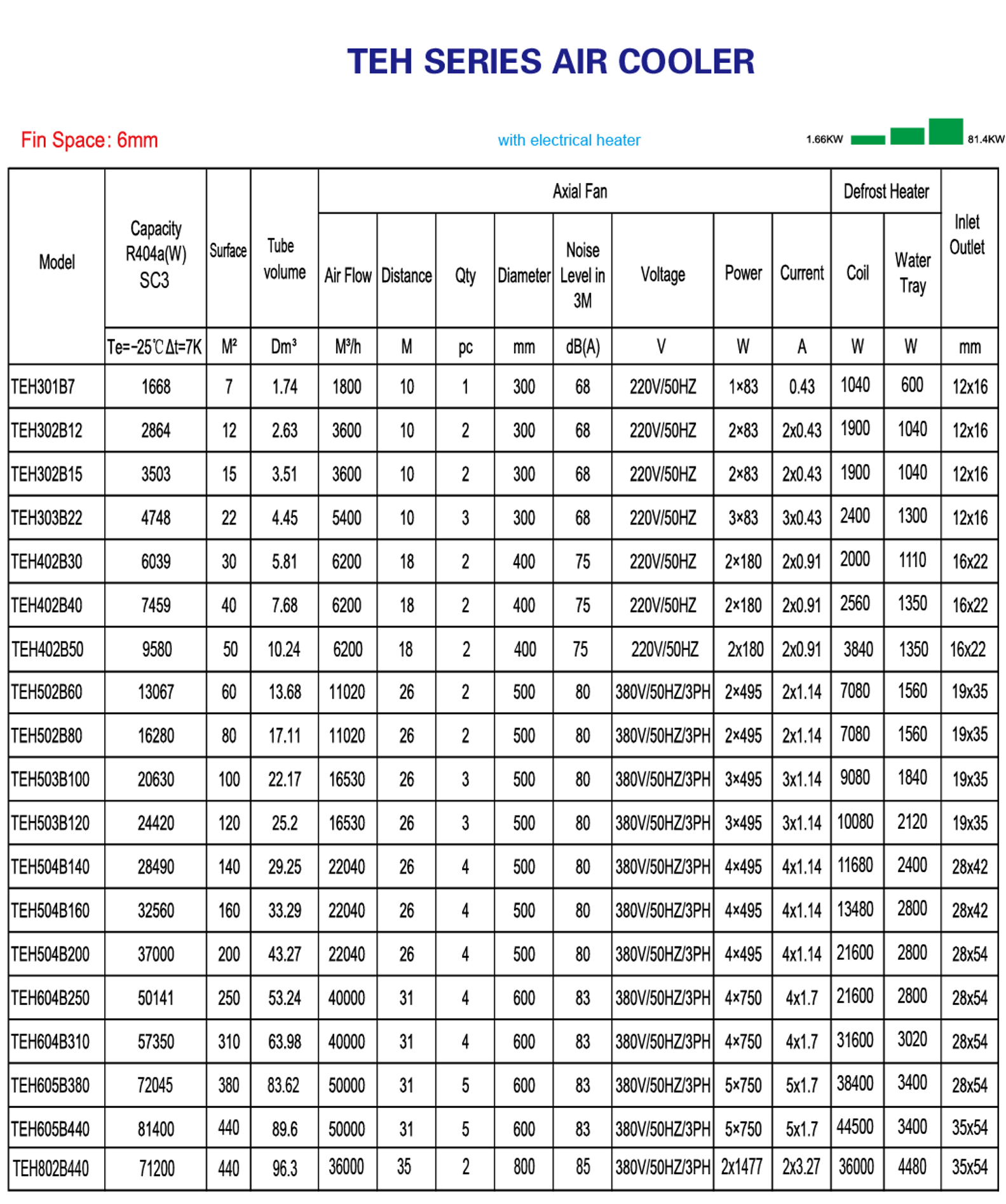 TEH•••B for medium temperatures (≥ -15 °C) with 6 mm fin spacing, electric defrost version (ED) is recommended;