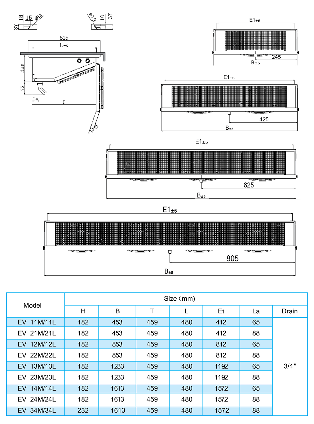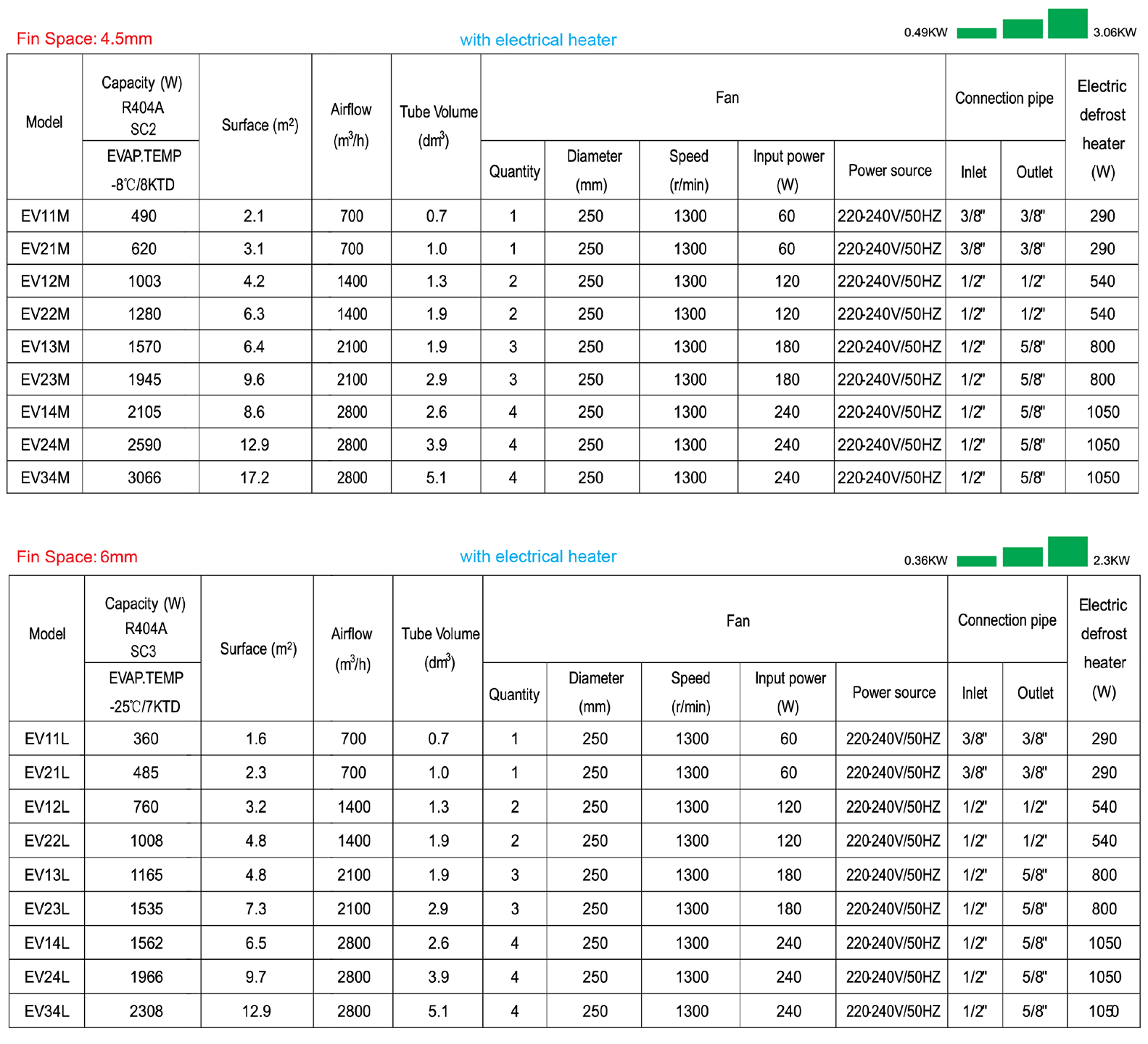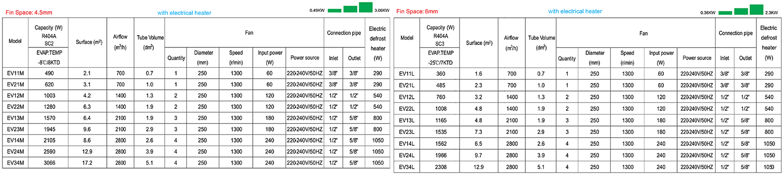 EV•••L for lower temperatures (≥-25 ℃) with 7 mm fin spacing and ED electric defrost.