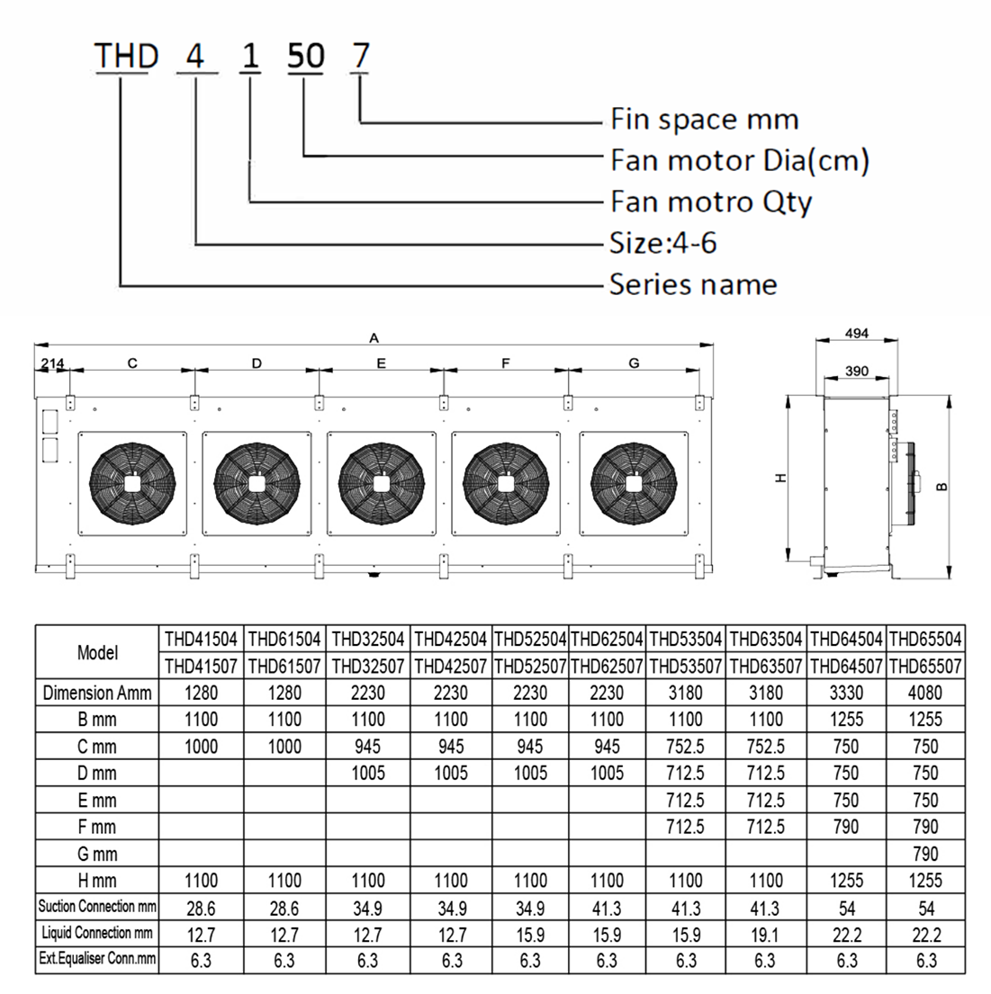 THD series unit air coolers apply high-efficiency inner grooved copper pipes & staggered pattern design, and the diverting technology and advanced fin flanging technology that have been improved through continuous tests ensure that the air cooler has high efficiency, delayed frosting time and stable room temperature.