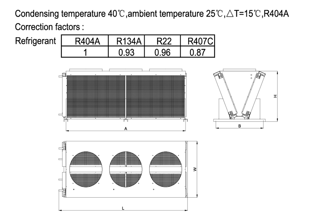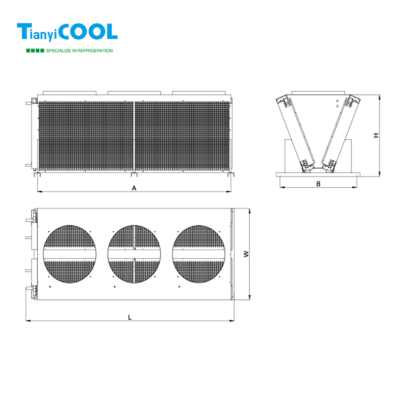 FNV series condenser adopts V-shaped structure design with top outlet air, which belongs to high-efficiency air-cooled condenser and is suitable for industrial refrigeration scenes such as large commercial cold storage, supermarket and logistics cold storage.